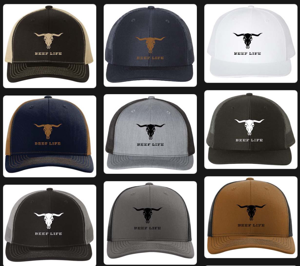 Show your passion for the ranching lifestyle with our Beef Life embroidered caps, designed for comfort, durability, and timeless western style. Each cap features a bold longhorn skull logo with the iconic Beef Life text, making it the perfect accessory for work, casual wear, or outdoor adventures.
